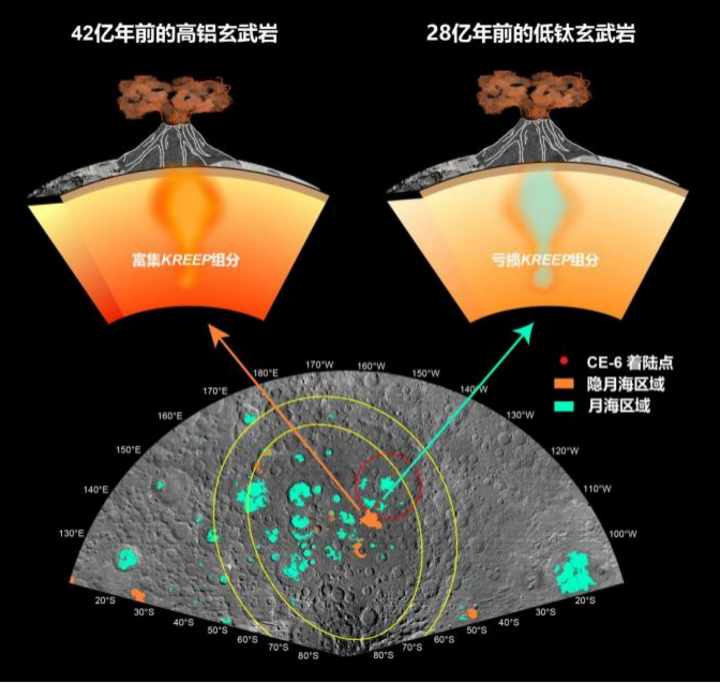 嫦娥六號月球樣品記錄的兩期玄武質(zhì)火山活動及其月幔源區(qū)性質(zhì)示意圖。(中國科學(xué)院供圖)