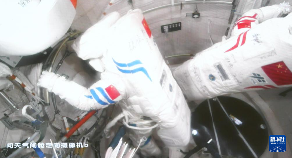 這是8月15日在北京航天飛行控制中心屏幕上拍攝的神舟二十號(hào)乘組航天員陳冬(左)與王杰準(zhǔn)備出艙的畫面。新華社記者 厲彥辰 攝