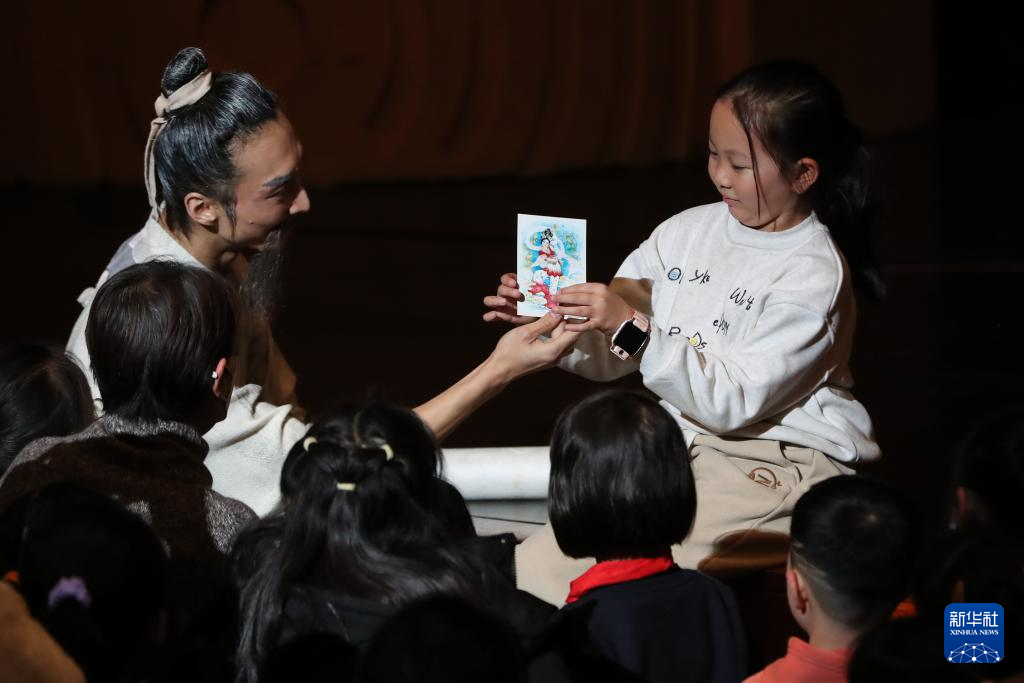 11月28日晚,演員在中場休息間隙與臺下觀眾互動并贈送《絲路花雨》明信片。