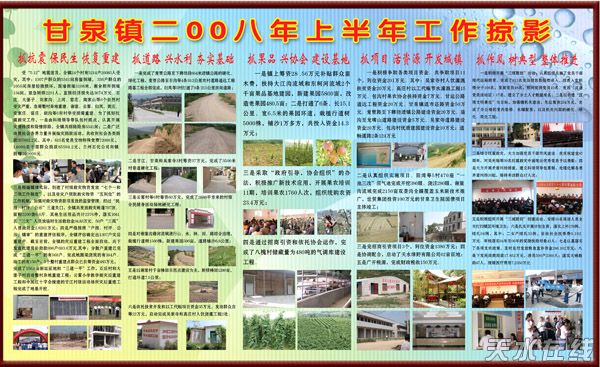 5.甘泉鎮(zhèn)小城鎮(zhèn)建設(shè)及主街道硬化:甘泉鎮(zhèn)1995年被建設(shè)部列為“全國(guó)第一批小城鎮(zhèn)建設(shè)試點(diǎn)鎮(zhèn)”,2006年被命名為“全省小城鎮(zhèn)建設(shè)重點(diǎn)鎮(zhèn)”,2008年被省發(fā)改委列為全省“第二批小城鎮(zhèn)發(fā)展改革試點(diǎn)鎮(zhèn)”。近年來,甘泉鎮(zhèn)始終把小城鎮(zhèn)建設(shè)列為工作重點(diǎn),切實(shí)加大基礎(chǔ)設(shè)施建設(shè),城鎮(zhèn)面貌發(fā)生了巨大變化。一是籌資76萬元,完成了麥(積)賈(河)公路至下街牌坊640米公路的硬化、綠化、亮化工程;籌資120萬元啟動(dòng)了上街牌坊至下街牌坊長(zhǎng)946米主街道拓寬改建工程。二是啟動(dòng)了玉蘭等9村文化廣場(chǎng)建設(shè),目前已完成6村。三是啟動(dòng)了甘泉、玉蘭兩村人民舞臺(tái)建設(shè)工程,完成了投資800萬元的甘泉農(nóng)工貿(mào)市場(chǎng)二期建設(shè)工程。四是籌資234萬元,新建1200多平方米三層辦公樓一幢,極大地改善了鎮(zhèn)機(jī)關(guān)辦公條件。 (麥積區(qū)委外宣辦:吳全輝 董斌博)