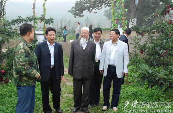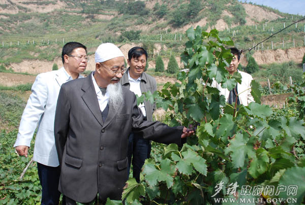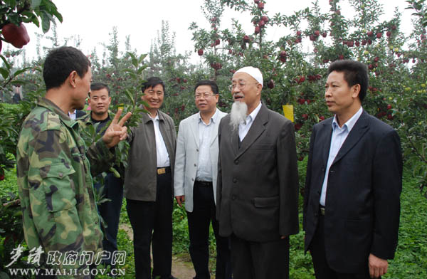 9月15日上午,專程前來參加2009’中國蘋果年會暨天水“花!碧O果節(jié)的省政協(xié)副主席馬國瑜一行,在麥積區(qū)政協(xié)主席賈應(yīng)珍、區(qū)委副書記馬兆讓、區(qū)政協(xié)副主席海安民的陪同下,深入到麥積區(qū)南山萬畝優(yōu)質(zhì)花牛蘋果基地和社棠中山流域葡萄基地,參觀了解了該區(qū)“兩山”果品基地建設(shè)情況。