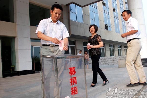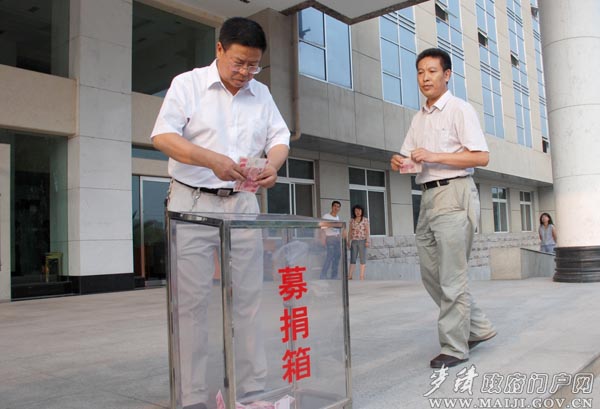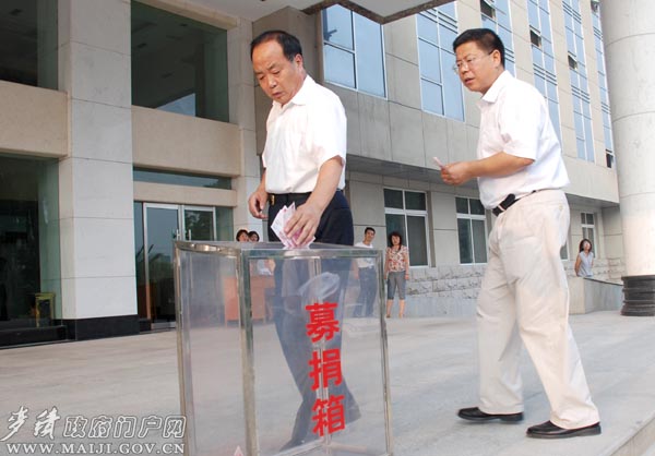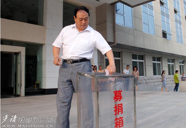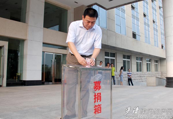 10日下午,麥積區(qū)四大組織機(jī)關(guān)干部職工向舟曲災(zāi)區(qū)捐款活動(dòng)在區(qū)政府大院舉行。區(qū)領(lǐng)導(dǎo)蒲軍、胡福林、張克強(qiáng)、賈應(yīng)珍等帶頭捐款、奉獻(xiàn)愛(ài)心,廣大干部職工紛紛響應(yīng)、慷慨解囊。據(jù)統(tǒng)計(jì),短短十幾分鐘,捐助現(xiàn)場(chǎng)就收到捐款35500元。