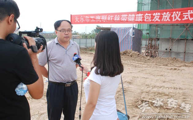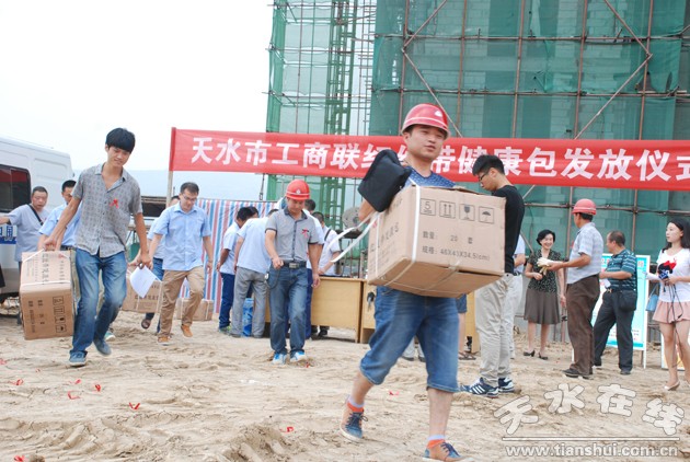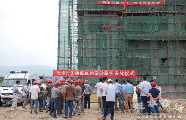7月31日,天水市工商聯(lián)紅絲帶健康包發(fā)放儀式在天水市華龍建筑工程有限公司施工地現(xiàn)場(chǎng)舉行,由全國(guó)工商聯(lián)捐贈(zèng)的300份紅絲帶健康包發(fā)放到了7家企業(yè)的300名外來(lái)務(wù)工人員手中,紅絲帶健康包內(nèi)裝有手套、毛巾、安全套水杯、筆記本等生活用活品和宣傳材料。