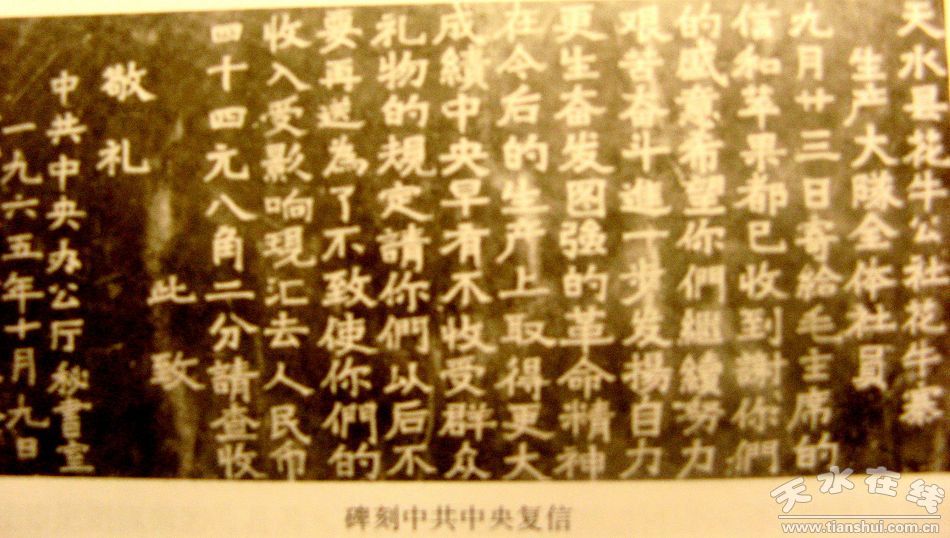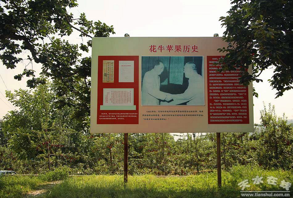 1965年,在香港國(guó)際博覽會(huì)上,“花!碧O果因其色度、果型、肉質(zhì)、含糖等四項(xiàng)指標(biāo)均優(yōu)于美國(guó)“蛇果”而一舉奪魁,享譽(yù)全球。這一消息傳來(lái),花牛村人都興奮不已。當(dāng)年9月23日,甘肅省天水縣花牛寨生產(chǎn)大隊(duì)的社員們精心挑選出兩箱剛剛采摘的蘋果給毛主席寄去,以表達(dá)對(duì)主席的敬仰之情,毛主席品嘗后,非常喜愛(ài),并在家中會(huì)見(jiàn)時(shí)任甘肅省省長(zhǎng)的天水籍著名人士鄧寶珊時(shí)用天水蘋果招待他,稱贊道:“你家鄉(xiāng)天水的蘋果好吃!”此后,中共中央辦公廳代表毛主席向花牛村村民專門致函感謝,信中還夾寄了44.82元錢;ㄅ4鍖⒏兄x信勒石樹碑,永志紀(jì)念。