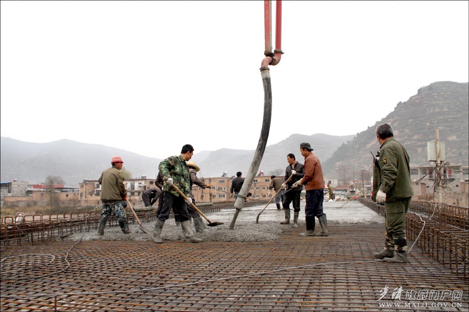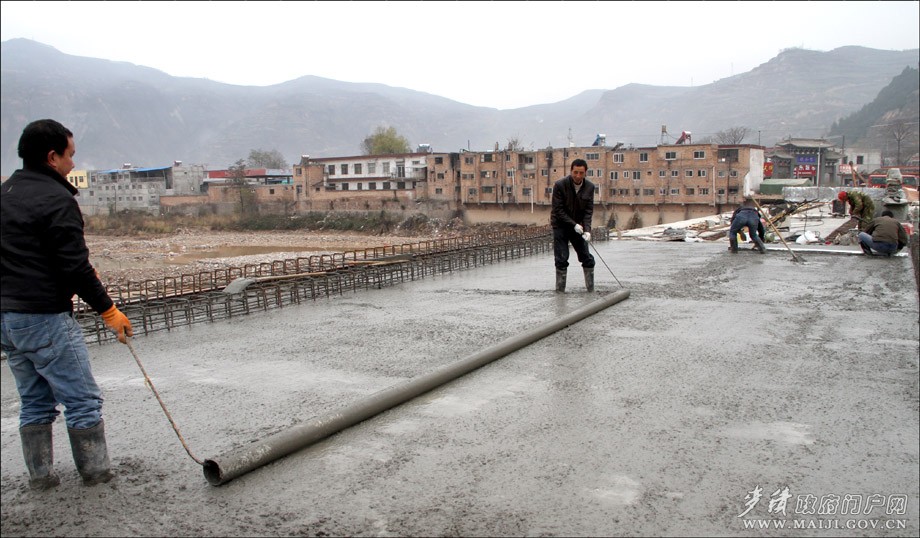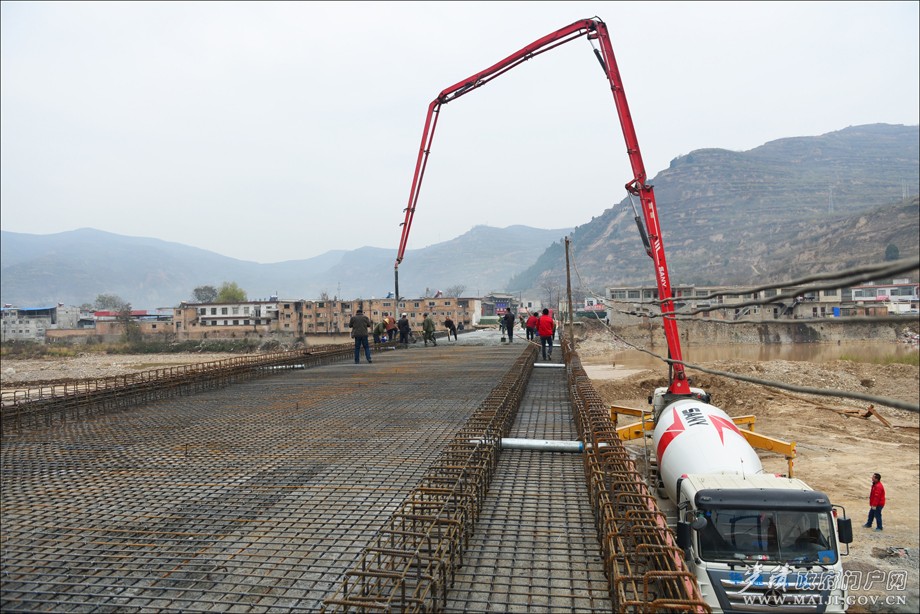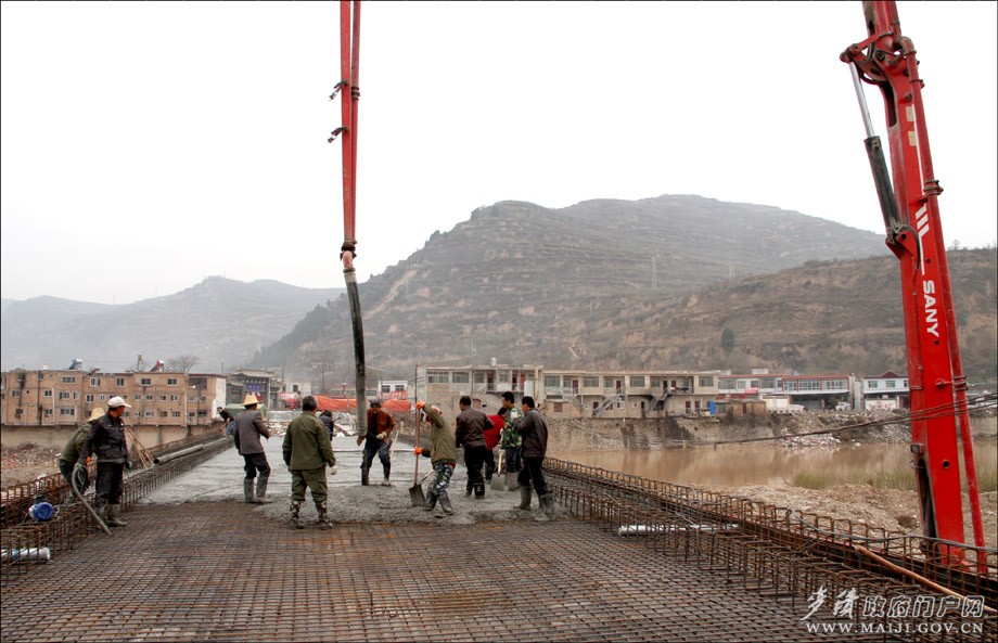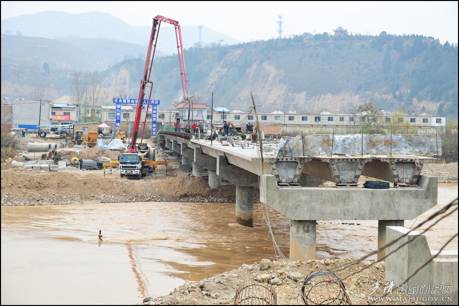 據(jù)該負(fù)責(zé)人介紹,原伯陽鎮(zhèn)興仁村渭河大橋始建于上世紀(jì)90年代,屬簡易便橋,是伯陽鎮(zhèn)興仁、半坡兩村及清水縣小泉等村群眾出行的主要通道。原橋受去年暴洪災(zāi)害影響,嚴(yán)重受損,無法正常通行,兩岸村民往來、學(xué)生上學(xué)要繞行至上游3公里外的寶蘭客專施工便橋上才能通過。為徹底解決當(dāng)?shù)厝罕姵鲂须y題,麥積區(qū)將伯陽鎮(zhèn)興仁大橋列為全區(qū)災(zāi)后重建重點交通工程,積極申報項目,廣泛籌措資金,及時在原址啟動新建了興仁村渭河大橋。新橋全長166.6m、寬7.5m,總投資逾700萬元。目前,已完成總工程量的80%,樁基、立柱和蓋梁的澆筑工作全面完成,正在架設(shè)橋梁、澆筑橋面,預(yù)計今年底可實現(xiàn)大橋合龍,明春將正式通車投用。