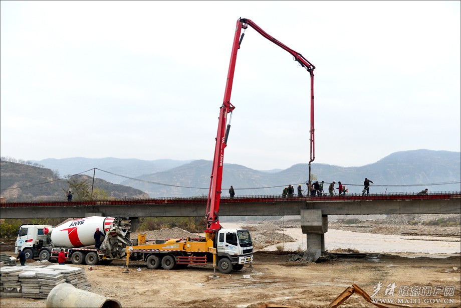 白色商砼車不時開來又開走,紅色長臂灌漿機(jī)突突向外噴著混凝土,數(shù)十名工人分組協(xié)作一邊澆筑橋面護(hù)欄一邊振筑罩面……整個工地忙碌有序,建設(shè)熱度絲毫不減。這是11月21日,小雪節(jié)氣前一天,筆者重訪麥積區(qū)伯陽鎮(zhèn)興仁大橋建設(shè)現(xiàn)場時看到的景象。