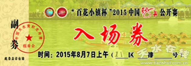 天水在線8月2日報道 “百花小鎮(zhèn)杯”2015年中國龍舟公開賽(甘肅·天水·麥積站)8月7日上午、下午和8月8日上午賽事門票開始在天水在線網(wǎng)店以1元價格出售。