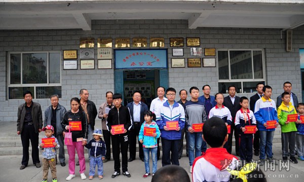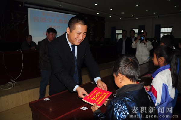 9月16日, 麥積區(qū)關(guān)工委舉行2015年貧困少兒救助金發(fā)放儀式, 區(qū)委常委、組織部長、區(qū)關(guān)工委副主任趙繼文出席儀式并講話, 區(qū)關(guān)工委常務(wù)副主任張鈺主持儀式。區(qū)關(guān)工委2015年貧困少兒救助活動共救助全區(qū)貧困少年兒童100名,全區(qū)17個鄉(xiāng)鎮(zhèn)和3個街道辦事處各5名,每人救助現(xiàn)金1500元。