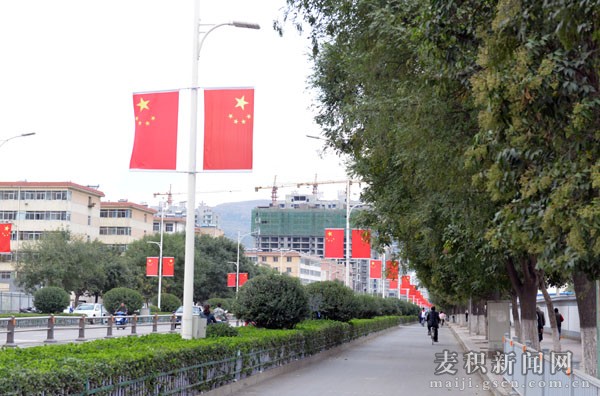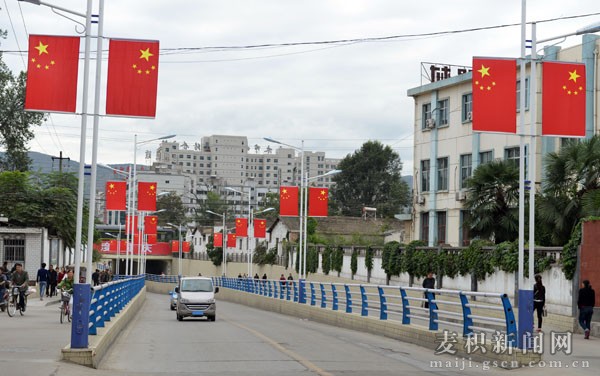 國慶期間的麥積城區(qū)到處洋溢著喜慶的氣氛。記者在市區(qū)幾條主干道上看到,兩側(cè)路燈桿、商鋪紛紛掛上了鮮艷的五星紅旗,在慶祝國慶佳節(jié)的同時,也為城市增添濃厚的節(jié)日氛圍。