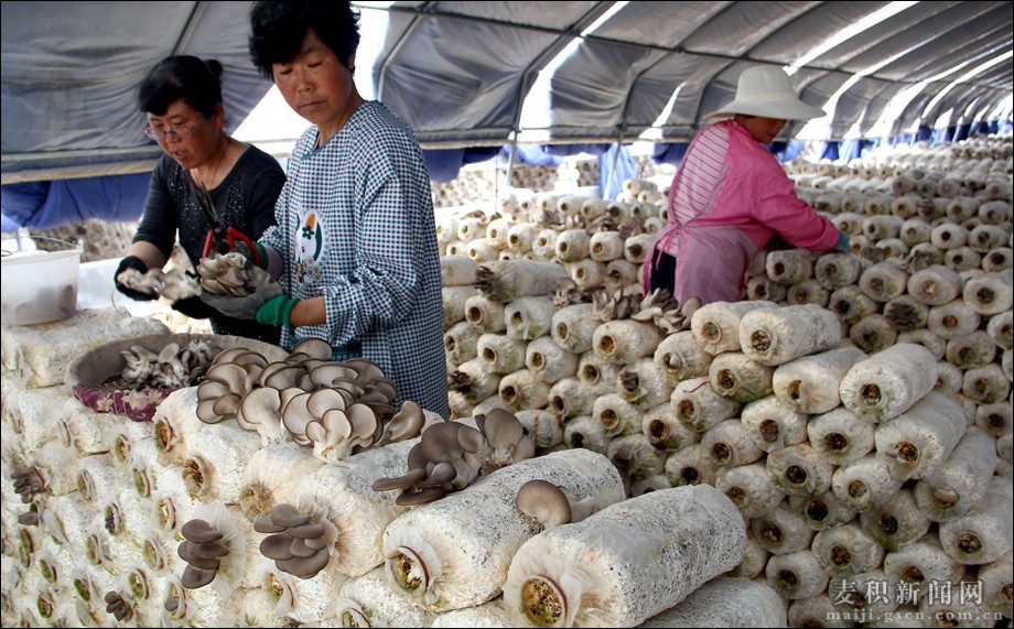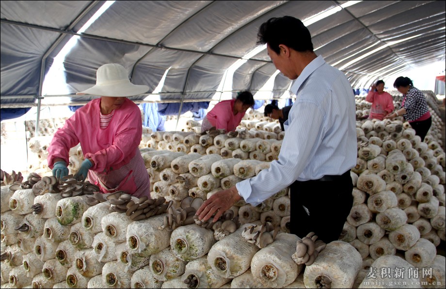 谷雨過后,氣溫逐漸升溫,午后的陽光已經(jīng)有點(diǎn)灼目。在花牛鎮(zhèn)白家河村支部書記白青軍的陪同下,記者來到位于白家河村的天水興農(nóng)友農(nóng)民專業(yè)合作社,大棚里一排排的菌棒擺放的整整齊齊,看起來蔚為壯觀,工人正在忙著采摘蘑菇,一派欣欣向榮的氣息。