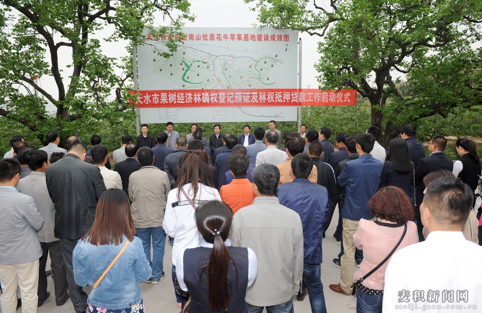 5月6日,天水市果樹經(jīng)濟林確權(quán)登記頒證及林權(quán)抵押貸款工作在麥積區(qū)南山萬畝花牛蘋果基地啟動。天水市副市長霍衛(wèi)平,市政府副秘書長王小春,市林業(yè)局局長王學(xué)鋒,麥積區(qū)委常委、副區(qū)長王彥軍和各縣區(qū)政府分管領(lǐng)導(dǎo)及林業(yè)局長等出席啟動儀式。