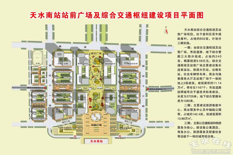 天水南站站前廣場及綜合交通樞紐項目位于麥積區(qū)花牛鎮(zhèn)趙崖村,東至在建高鐵佳苑、西至廿鋪工業(yè)園區(qū)4號路、南至高鐵天水南站、北至羲皇大道,占地約802畝。建設(shè)集綜合交通樞紐、站前廣場、城市公園、旅游服務(wù)中心、商業(yè)辦公及市政設(shè)施等于一體的城市綜合體。項目整體規(guī)劃分三期實施。一期工程由站前廣場及綜合交通樞紐、市政道路和地下綜合管廊三大部分組成,占地約240畝,建筑面積約11.14萬㎡,概算投資約9.56億元;主要建設(shè)長途客運站、公交站、旅游大巴站、出租車站、社會車輛停車庫、商業(yè)與換乘服務(wù)大廳等,擬建停車位1167個。二期占地約142.4畝,建筑面積13.86萬㎡,主要建設(shè)旅游集散中心、商業(yè)服務(wù)中心及中軸線公園等。三期主要以交通樞紐和旅游服務(wù)為核心,建設(shè)集公寓酒店、商務(wù)辦公、旅游服務(wù)及配套校舍等功能于一體的城市綜合體。