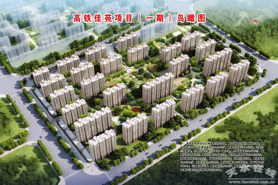 高鐵佳苑項目位于麥積區(qū)花牛鎮(zhèn)趙崖村,東至天水場站、西至在建天水南站站前廣場、南至在建高鐵、北至羲皇大道,項目總占地面積約438畝,其中建設(shè)用地308畝,總建筑面積約48.5萬㎡,概算總投資約27.44億元。計劃分三期建設(shè)。一期工程占地140畝,建筑面積22.67萬㎡,概算投資約14.64億元,建設(shè)25幢1638套住宅,地下停車位1570個;二期建筑面積16.03萬平方米,概算投資8.05億元,建設(shè)18幢1170套住宅,地下停車位1116個;三期建筑面積9.79萬平方米,概算投資4.75億元,建設(shè)11幢715套住宅,地下停車位682個。