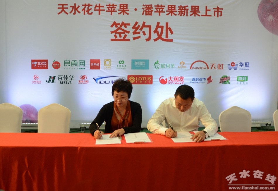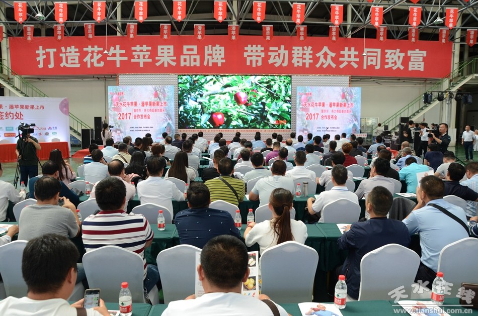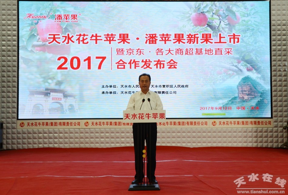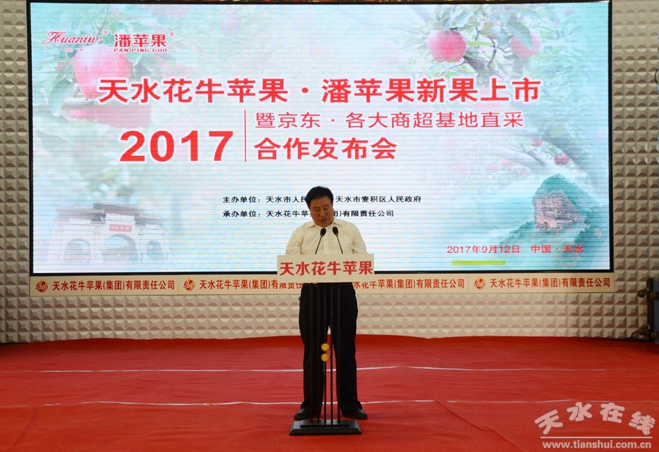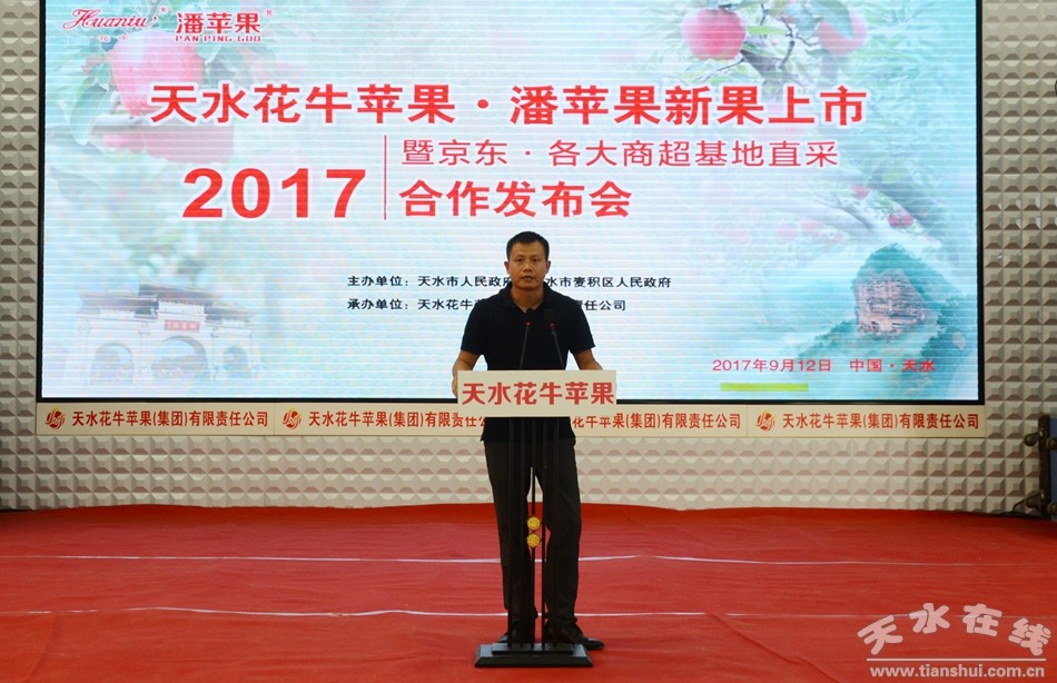 9月12日上午,2017天水花牛蘋果·潘蘋果新果上市暨京東·各大商超基地直采合作發(fā)布會在天水花牛蘋果產(chǎn)業(yè)園舉行。天水市副市長張建杰,京東集團副總裁、生鮮事業(yè)部總裁王笑松,各大商超及客商代表等100多人參加了發(fā)布會。