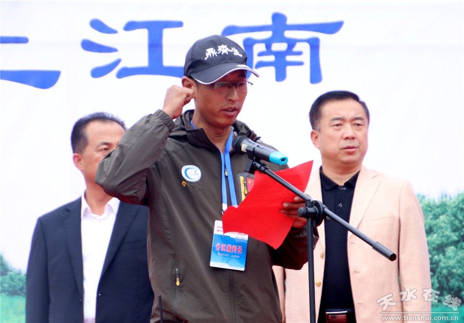 (國家三級垂釣大師郭慶代表全體運動員宣誓)