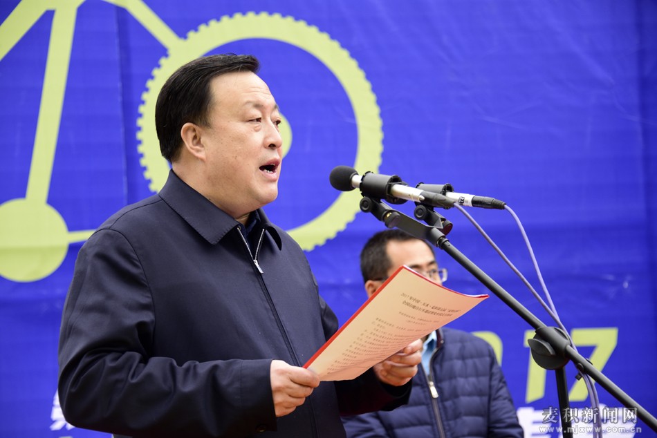 甘肅省自行車(chē)運(yùn)動(dòng)訓(xùn)練管理中心主任、自行車(chē)運(yùn)動(dòng)協(xié)會(huì)副主席劉順義,天水市人大常委會(huì)副主任蒲朝輝,市政府副市長(zhǎng)張建杰,市政協(xié)副主席蘇定武,天水師范學(xué)院黨委副書(shū)記師平安,麥積區(qū)委書(shū)記張智明共同為2017年中國(guó)·天水·麥積第五屆“麥積山杯”全國(guó)山地自行車(chē)邀請(qǐng)賽鳴槍開(kāi)賽。