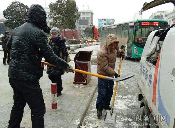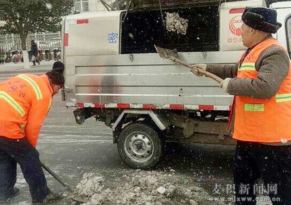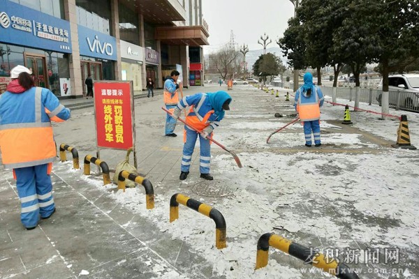 穿戴著橘紅色工作衣帽的麥積環(huán)衛(wèi)清潔工們,一樣不甘落后,盡管臉頰被狂舞的寒風(fēng)凜冽成了紫紅色,但是他們的笑容依然燦爛如初,盡管腳上的鞋子已被雪水浸透,雙腳凍得發(fā)麻,但他們依然沒有停止前行的腳步,他們你一鐵鍬我一掃把,一鏟一掃間,盡顯著“麥積環(huán)衛(wèi)人”十足的精氣神。