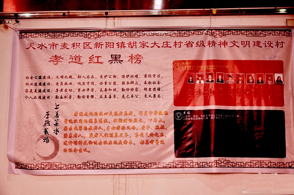 設立善行義舉和孝道紅榜。村上設立了“善行義舉榜”和孝道“紅榜”,以張榜公示的方式,將近年涌出來的“中國好人—胡勤真”、“市級道德模范—王婉花”、“區(qū)級十大杰出奉獻青年—胡成奎”等農(nóng)村優(yōu)秀道德模范進行集中展示和大力宣傳,充分發(fā)揮示范引領作用,用他們的嘉言懿行垂范鄉(xiāng)里,涵育文明鄉(xiāng)風。
