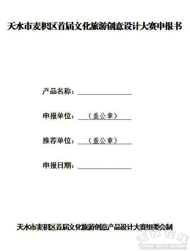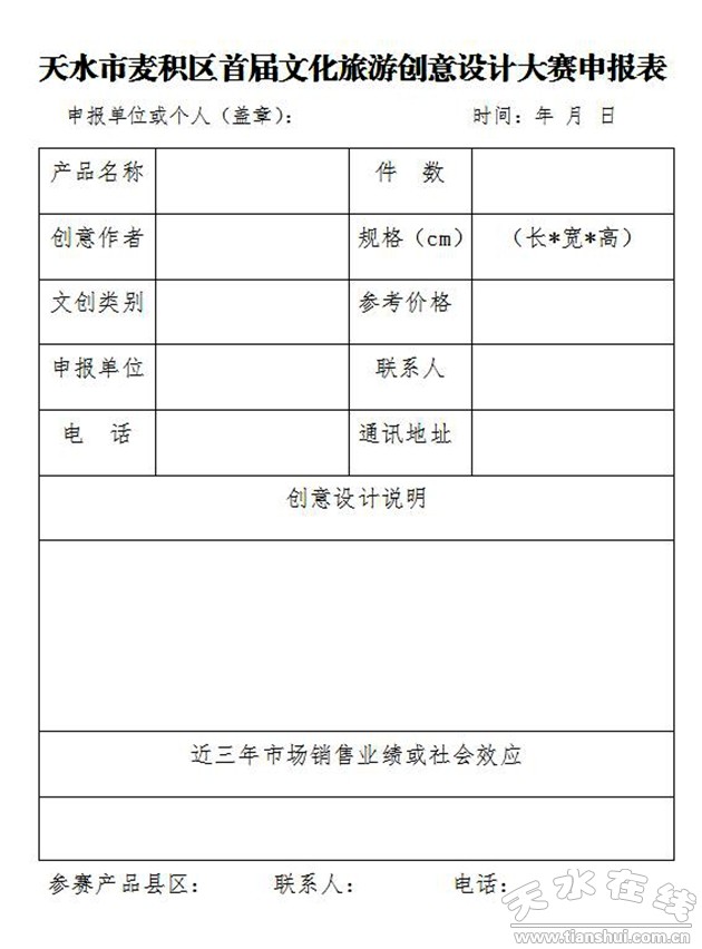 附件:天水市麥積區(qū)首屆文化旅游創(chuàng)意產(chǎn)品設(shè)計大賽申報書