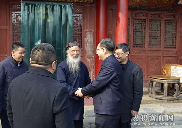 麥積區(qū)融媒體中心訊(記者 李云強(qiáng))帶著家鄉(xiāng)人民的新春祝福,1月22日,天水市政協(xié)副主席、麥積區(qū)委書記張智明,區(qū)人大常委會(huì)主任趙繼文,區(qū)政協(xié)主席高志強(qiáng),區(qū)委常委、副區(qū)長(zhǎng)周岳紅,區(qū)人大常委會(huì)副主任竇順良等四大組織領(lǐng)導(dǎo)一行專程赴陜西周至縣樓觀臺(tái),看望了全國(guó)政協(xié)常委、全國(guó)政協(xié)民族和宗教委員會(huì)副主任、中國(guó)道教協(xié)會(huì)咨議委員會(huì)主席任法融,并送去了麥積區(qū)65萬(wàn)人民的良好祝愿和新春祝福。