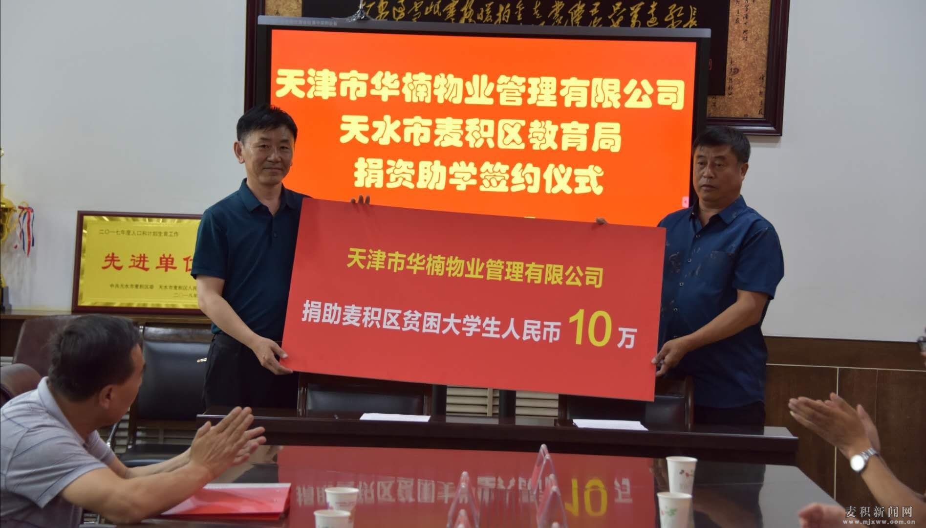 麥積區(qū)融媒體中心訊(記者 龍云飛 王瑋瑕)6月14日,天津市華楠物業(yè)管理有限公司在麥積區(qū)開展捐資助學(xué)活動,向麥積區(qū)20名貧困大學(xué)生捐贈助學(xué)金10萬元,并向麥積區(qū)殘聯(lián)捐贈電腦兩臺。天津市華楠物業(yè)管理有限公司總經(jīng)理崔志華、副總經(jīng)理張廣嶺,麥積區(qū)委常委、副區(qū)長高福光,副區(qū)長成紅梅出席捐贈儀式。