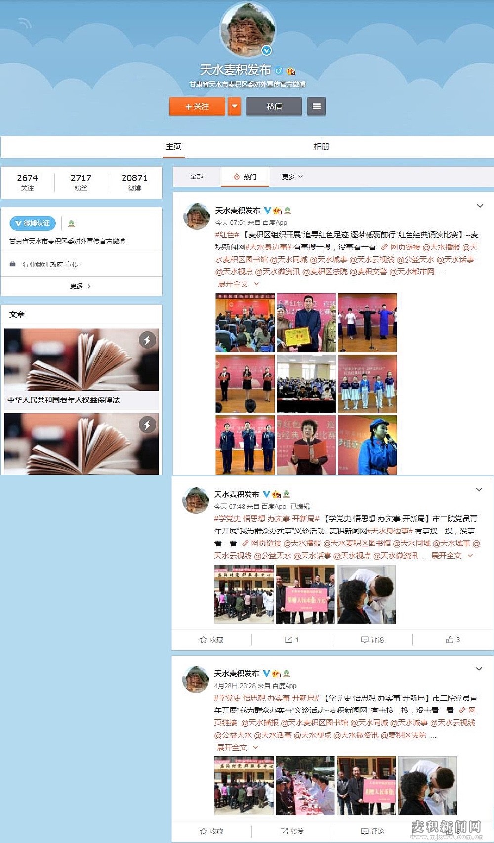 區(qū)融媒體中心充分發(fā)揮主流媒體作用,第一時(shí)間開設(shè)“學(xué)黨史 悟思想 辦實(shí)事 開新局”專欄,相繼推出“麥積·百年紅色記憶”“黨史百年·天天讀”“網(wǎng)絡(luò)中國(guó)節(jié)•清明”“我為群眾辦實(shí)事”“奮斗百年路 啟航新征程”等專題專欄,及時(shí)在麥積新聞網(wǎng)、麥積電視、廣播FM99.5、掌中麥積和新甘肅入駐號(hào)、新華社現(xiàn)場(chǎng)云、學(xué)習(xí)強(qiáng)國(guó)以及麥積發(fā)布微信公眾號(hào)、頭條號(hào)、甘肅號(hào)、微博、抖音、快手等各個(gè)新媒平臺(tái)發(fā)布推送。新推出了《百年芳華 百年榮光》廣播節(jié)目和《主播說(shuō)黨史》等系列短視頻,廣泛宣傳麥積區(qū)各階層開展黨史學(xué)習(xí)教育開展情況及特色亮點(diǎn)、經(jīng)驗(yàn)做法,充分展示百年以來(lái)麥積籍優(yōu)秀共產(chǎn)黨員、發(fā)生在麥積區(qū)的重大歷史事件、紅色遺址等,讓廣大群眾充分了解麥積革命發(fā)展歷程、銘記革命先輩的英勇事跡。截至目前共發(fā)布300余條新聞,制作H5和海報(bào)10余條,轉(zhuǎn)載推送優(yōu)秀視頻15條,并在各新媒體平臺(tái)推送黨史學(xué)習(xí)教育類新聞信息共計(jì)1230余條,及時(shí)轉(zhuǎn)載刊發(fā)人民日?qǐng)?bào)、新華社等媒體的重要評(píng)論和重要報(bào)道,宣傳習(xí)近平總書記關(guān)于“黨史學(xué)習(xí)教育”的重要講話和重要批示精神,營(yíng)造了良好的學(xué)習(xí)輿論氛圍。