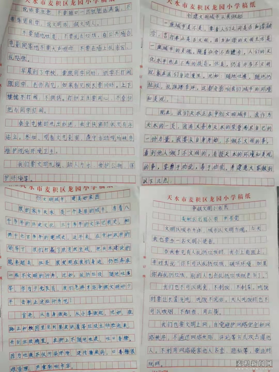 此外,全校各班還以“創(chuàng)建全國文明城市”為主題召開主題班會,學(xué)習(xí)了龍園小學(xué)學(xué)生乘坐公交車文明禮儀等相關(guān)內(nèi)容。同時,積極開展了小手拉大手、共建文明城——主題繪畫、爭做文明小市民——主題征文等一系列豐富多彩的活動。學(xué)生們紛紛表示要做文明事,當(dāng)文明人,樹文明風(fēng),以實(shí)際行動為創(chuàng)建文明城市貢獻(xiàn)自己的力量。