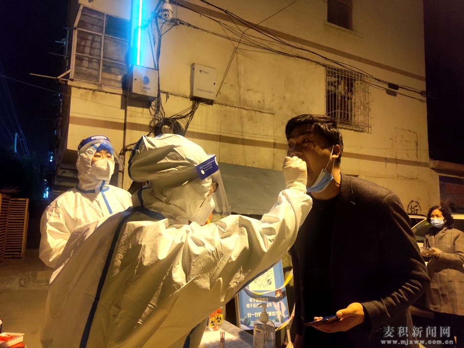 當天晚上,麥積區(qū)道北街道濱河路水廠家屬院、三角地、西閘口家屬樓等小區(qū)在西排洪渠樣本采集點進行核酸檢測采樣。在瑟瑟秋風里,等待檢測的居民都佩戴口罩、保持一米線間隔,一切都井然有序。