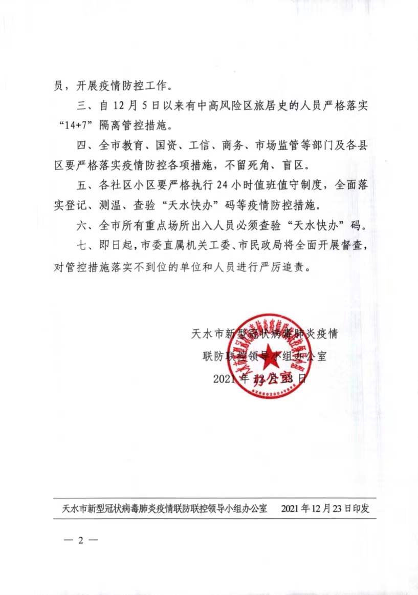 (2021/12/24 10:21:46) 來源:天水市麥積區(qū)新冠肺炎疫情聯(lián)防聯(lián)控聯(lián)治領(lǐng)導(dǎo)小組  打印本頁