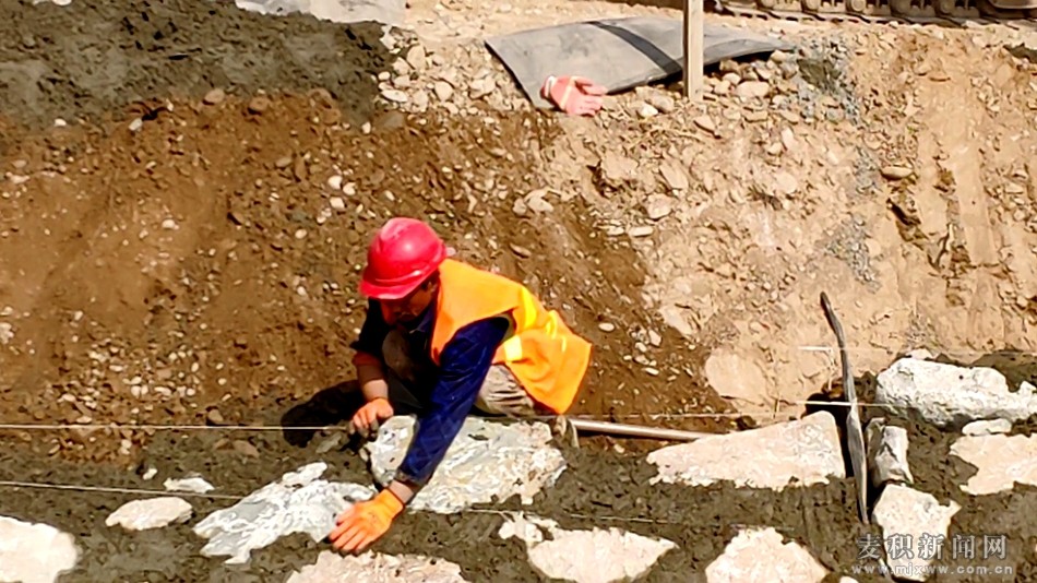 3月8日,記者來到渭河干流天水市麥積區(qū)石佛段看到,轟隆隆的吊車和鏟車不知疲倦地伸出機械臂,挖、抓、撥、放動作嫻熟地把一堆石塊分批投放到3.2km的石佛鎮(zhèn)峪口至石崖段渭河干流防洪修堤標(biāo)段,身穿橙色馬甲的工人將機械臂放置的石塊移動堆砌,和著石灰固定在堤防斜坡上。