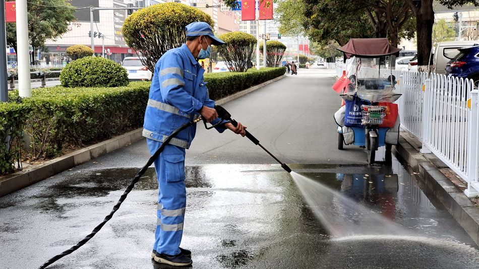 記者來到作業(yè)現(xiàn)場看到,在道路兩旁的人行道上,環(huán)衛(wèi)工人手持高壓水槍對路面沉積污垢進行沖刷,路面不時有噴霧車和吸塵車經過持續(xù)作業(yè)。在環(huán)衛(wèi)工人的持續(xù)作業(yè)下,路面頓時清潔且濕潤。