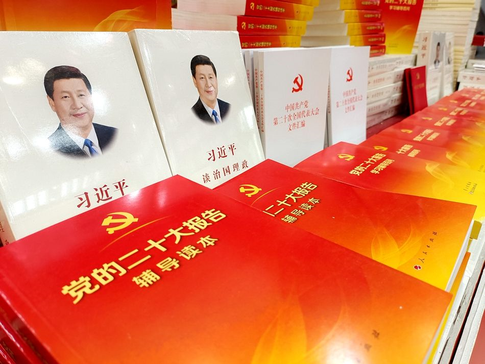 展臺(tái)上的書籍種類十分豐富,除了有《中國(guó)共產(chǎn)黨章程》《中國(guó)共產(chǎn)黨第二十次全國(guó)代表大會(huì)報(bào)告》《中國(guó)共產(chǎn)黨第二十次全國(guó)代表大會(huì)文件匯編》《黨的二十大報(bào)告輔導(dǎo)讀本》《黨的二十大報(bào)告學(xué)習(xí)輔導(dǎo)百問(wèn)》以及掛圖《熱烈慶祝中國(guó)共產(chǎn)黨第二十次全國(guó)代表大會(huì)勝利召開(kāi)》6類黨的二十大精神學(xué)習(xí)輔導(dǎo)讀物外,還有《習(xí)近平談治國(guó)理政》《總體國(guó)家安全觀學(xué)習(xí)綱要》《習(xí)近平生態(tài)文明思想學(xué)習(xí)綱要》等重點(diǎn)圖書。