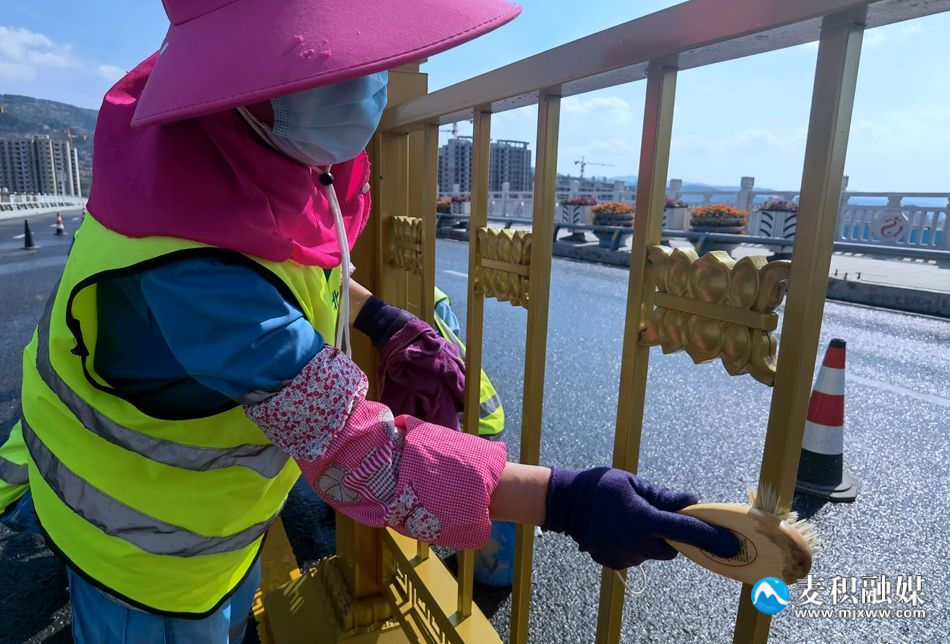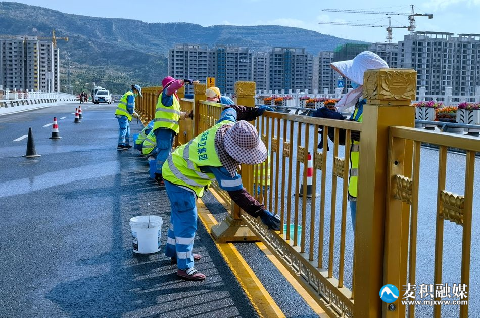 6月15日上午9時,在麥積區(qū)二十里鋪大橋上,一臺水車、一根高壓水管和數(shù)十名環(huán)衛(wèi)清洗工人同時出動,在高壓水槍沖洗后,工人們手拿刷子、抹布仔細(xì)地擦拭著新更換的隔離欄桿。