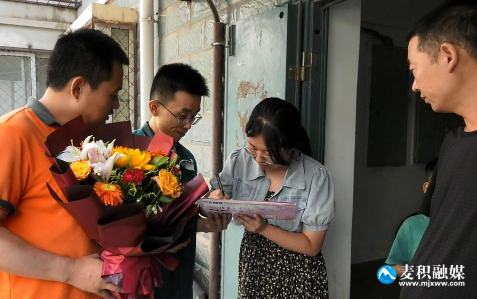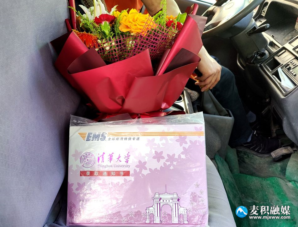 上午9點(diǎn)30分,一輛綠色的郵政快遞配送車開進(jìn)麥積區(qū)某小區(qū),郵政公司的工作人員帶著快遞和鮮花來到單元樓門口,經(jīng)投遞員仔細(xì)核對考生身份信息后,鄭重地將一份來自清華大學(xué)的錄取通知書交到師瑜同學(xué)手中并向她表示祝賀。
