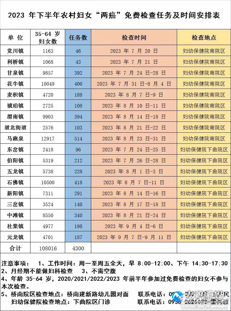 本次檢查對(duì)象:全區(qū)4300名農(nóng)村35-64歲婦女進(jìn)行免費(fèi)“兩癌”篩查。近三年(2020-2023年前半年)已參加過“兩癌”檢查的農(nóng)村婦女不參與本次篩查。檢查時(shí)間:2023年7月20日至9月15日;檢查地點(diǎn):區(qū)婦保院橋南院區(qū)(橋南建新路幼兒園對(duì)面)、區(qū)婦幼保健院下曲院區(qū)。
