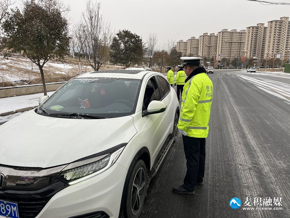 為應(yīng)對(duì)本輪降雪,麥積交警在急彎陡坡、隧道橋梁、長(zhǎng)下坡路段、城市快速路等處科學(xué)部署警力,并通過定點(diǎn)執(zhí)勤與流動(dòng)巡邏相結(jié)合的方式,加大對(duì)轄區(qū)道路巡邏管控力度,采取警燈警示、喊話器提示等措施,提示廣大駕駛員冰雪天氣下減速慢行,保持安全車距。