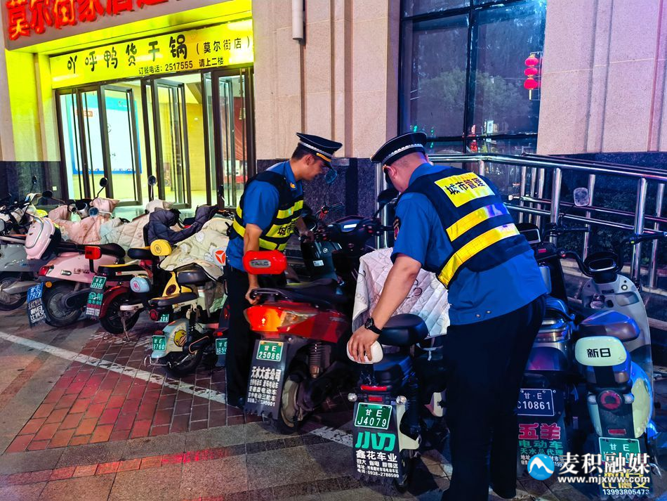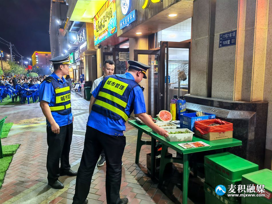 晚上9點(diǎn),在麥積區(qū)莫爾街,為確保夜市環(huán)境整潔、經(jīng)營有序、管理規(guī)范,城管執(zhí)法隊員細(xì)致檢查各個設(shè)有外擺攤位的店鋪,要求經(jīng)營者在規(guī)定時段內(nèi)文明經(jīng)營,履行好環(huán)境衛(wèi)生保護(hù)職責(zé)。當(dāng)發(fā)現(xiàn)個別夜市攤位保潔不及時、一桌一桶配置不到位等不規(guī)范行為時,執(zhí)法隊員立即現(xiàn)場糾正、協(xié)助整改。同時,要求經(jīng)營者桌椅統(tǒng)一擺放整齊,不得占用盲道、機(jī)動車道、人行通道,嚴(yán)格檢查在店外劃線范圍內(nèi)經(jīng)營的夜市門店是否規(guī)范地膠鋪設(shè),督促商戶及時清理門前垃圾桶和食物殘渣、白色垃圾等。