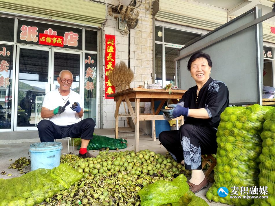 在市場(chǎng)旁經(jīng)營一家便利店的王學(xué)安正和自己的老伴戴著手套,拿著削皮刀給自家剛打下來的青皮核桃去皮,兩位老人邊說邊笑地告訴記者:“我們家里的核桃樹一共兩畝八分地,現(xiàn)在每斤賣六塊,價(jià)錢也算好,賣得好著呢。”