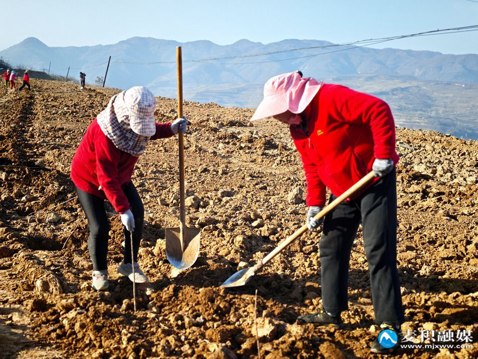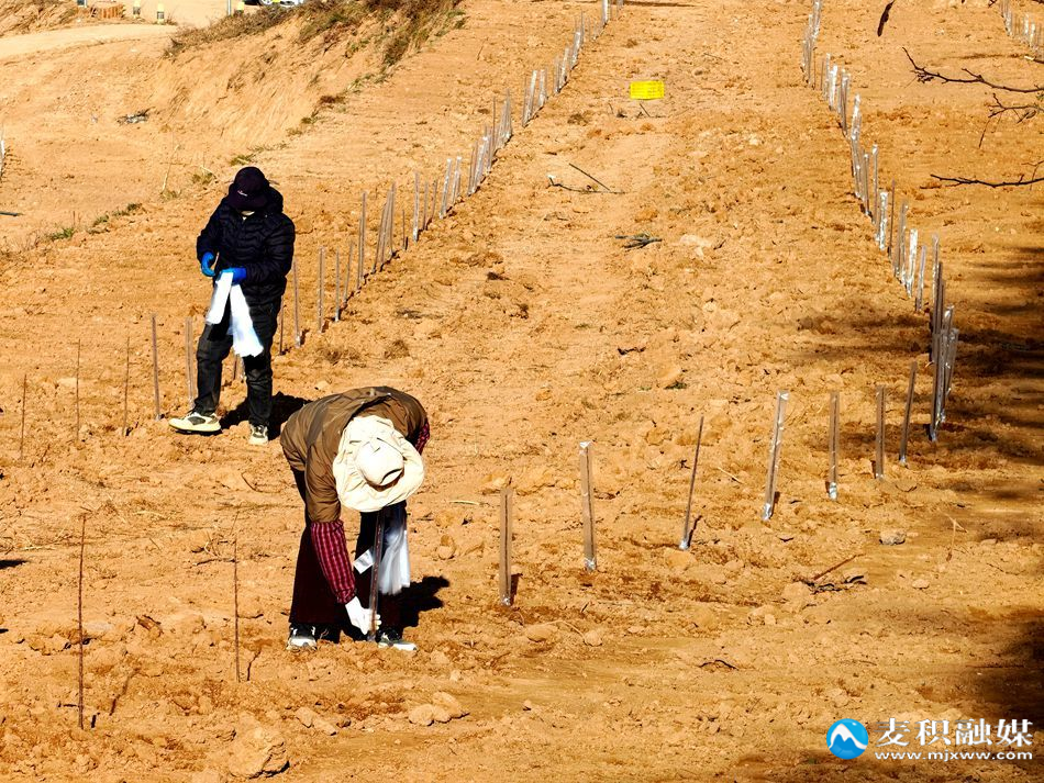 在花牛鎮(zhèn)九峪村果園改造現(xiàn)場,挖掘機(jī)轟鳴作響,翻整土地;村民們分工協(xié)作,安裝地網(wǎng)、栽植新苗、套上保溫袋、施撒肥料。與此同時(shí),現(xiàn)代化滴灌設(shè)施鋪設(shè)工作同步推進(jìn),寒冷天氣中呈現(xiàn)出一幅“冬忙”的火熱圖景。