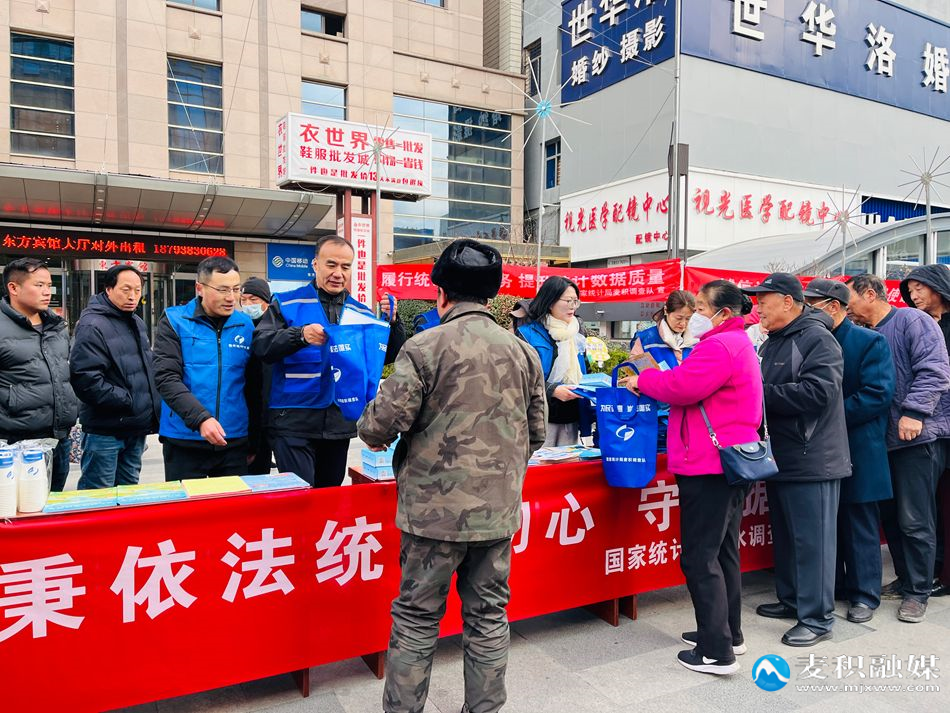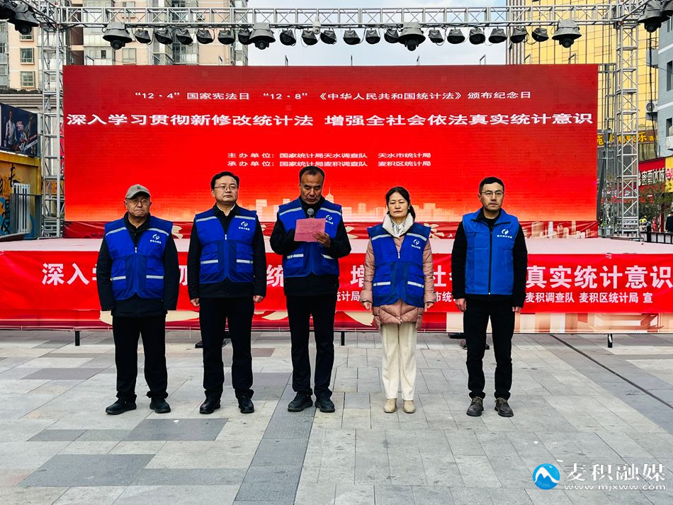 麥積區(qū)融媒體中心訊(記者馬玉婷王瑋瑕)為進一步增強全社會依法統(tǒng)計、真實統(tǒng)計意識,12月8日,由國家統(tǒng)計局天水調查隊、天水市統(tǒng)計局主辦,國家統(tǒng)計局麥積調查隊、麥積區(qū)統(tǒng)計局承辦的“12.8”統(tǒng)計法頒布紀念日宣傳活動在麥積區(qū)商埠路步行街舉行。本次活動以“深入學習貫徹新修改統(tǒng)計法增強全社會依法真實統(tǒng)計意識”為主題。國家統(tǒng)計局天水調查隊黨組書記、隊長劉斌出席活動并致辭,麥積區(qū)委常委、常務副區(qū)長王軍龍出席活動。