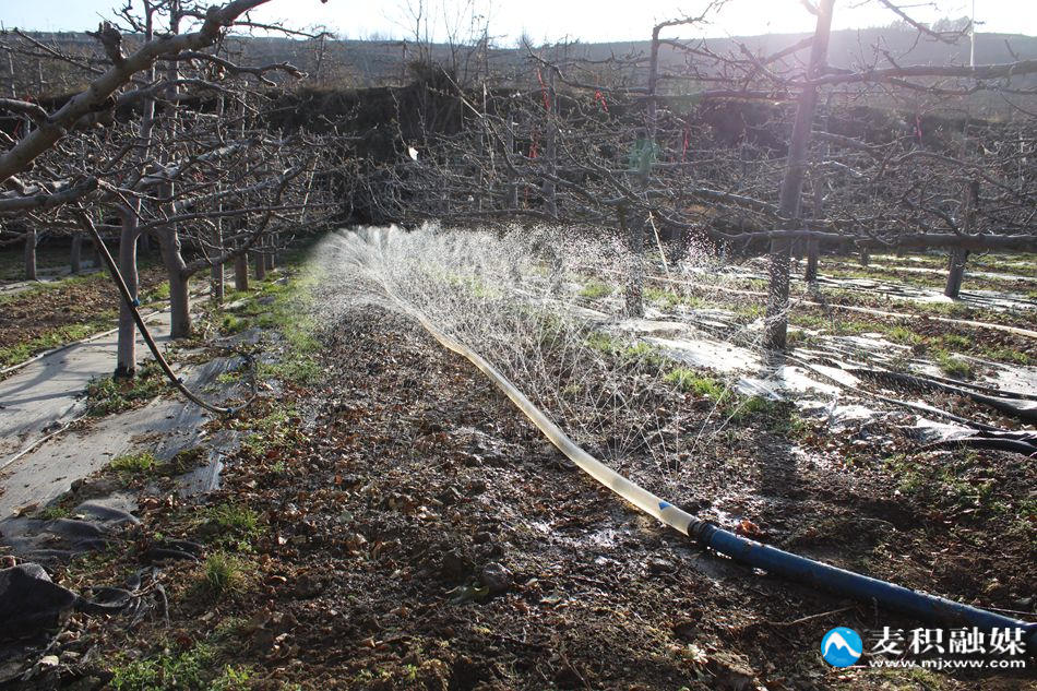 冬日陽光下,水流沿著覆蓋地膜的樹行緩緩滲入,細密的水霧均勻浸潤樹盤土壤,配合地膜覆蓋實現(xiàn)節(jié)水保墑,讓水分緩慢滲透至根系深處,既高效補充了果樹越冬所需水分,又增強了樹木抗寒能力。同時開展的樹盤培土作業(yè),則為果樹根系構(gòu)建起了更加穩(wěn)固的保溫層。“合作社2280畝果園從月初就全面啟動冬管,剪樹、抹藥、澆地同步推進,提前疏除多余花胎,既能減輕明年疏花疏果的工作量,更能有效保障蘋果的品質(zhì)和產(chǎn)量!丙湻e區(qū)新民蘋果種植專業(yè)合作社辦公室主任奚義軍介紹道。