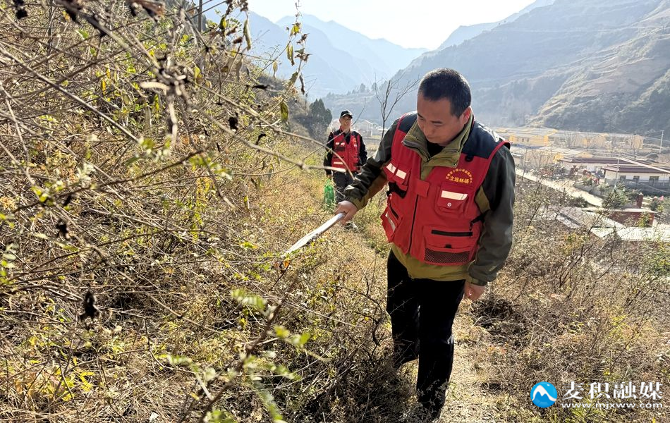 冬日時(shí)節(jié),記者在三岔鎮(zhèn)前進(jìn)村看到,身著橙色護(hù)林服的生態(tài)護(hù)林員身背著水壺、手拿宣傳單,穿梭在林間小道巡查排查火災(zāi)隱患。遇到勞作的村民,護(hù)林員們便遞上宣傳資料,用通俗的語言講解野外用火危害,提醒群眾嚴(yán)格遵守“進(jìn)山不用火、林區(qū)禁煙火”的安全規(guī)定。