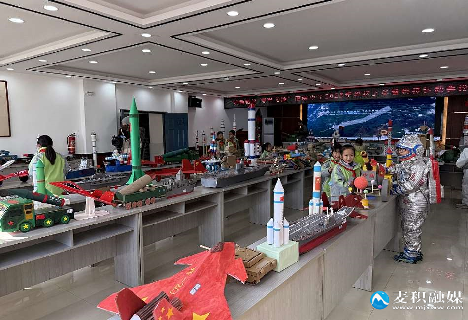 與此同時,校園內(nèi)同步展出了同學們親手制作的科技模型。一件件作品創(chuàng)意滿滿,整齊陳列,展現(xiàn)了孩子們對科學的熱愛與探索精神。三年級學生王思淼帶著自己的火箭模型自豪地介紹:“我參加的是模型展覽,做的是火箭模型。制作過程中爸爸媽媽一直陪我,還給我講了很多航空知識,讓我感受到科技的神奇。”
