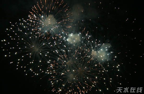 女:第三篇章是《創(chuàng)新發(fā)展》。寧?kù)o的山河,美麗的秦安,迷人的風(fēng)景。燃放的禮花滋潤(rùn)著這塊朝氣蓬勃的大地,越來(lái)越多,越來(lái)越快,仿佛踏著樂(lè)點(diǎn),在九天銀魚的帶領(lǐng)下,數(shù)枚煙花種子在中心爆發(fā),色彩向四周散開,層層疊疊,紛紛繁繁,令人眼花繚亂,飄灑輝映著滿天星光。秦安的明天必將像今晚的禮花一樣堆銀疊玉般瑰麗輝煌。本組焰火以九天銀魚、宮燈配以3-8寸高空禮花配合燃放。