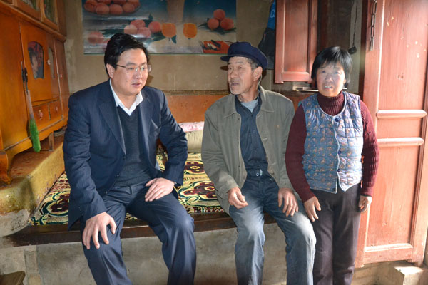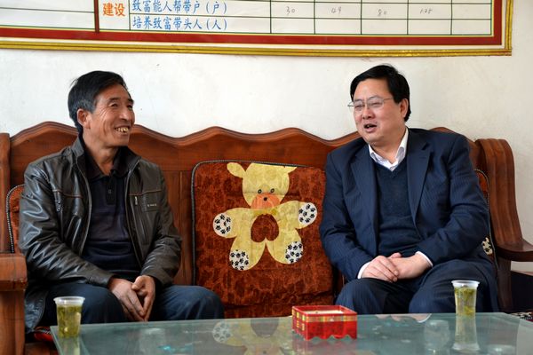 王東紅來(lái)到聯(lián)系戶(hù)馮全國(guó)家中。馮全國(guó)的妻子曾菊花一見(jiàn)到王書(shū)記,非常激動(dòng):“真沒(méi)想到縣委書(shū)記能親自到我家來(lái)……”,王書(shū)記親切地對(duì)她說(shuō):“你家是我聯(lián)系的幫扶戶(hù),今天我是來(lái)看望你們的,有什么困難就告訴我,我們一起想辦法,尋找致富門(mén)路,給家里增加收入!蓖鯐(shū)記和曾菊花親切地拉起了家常,了解家里的生活及家庭狀況。曾菊花一家四口人,丈夫馮全國(guó)常年有病在身,步入中年的他平日靠著貨郎擔(dān)勉強(qiáng)養(yǎng)家糊口,兩個(gè)孩子一個(gè)就讀于甘肅農(nóng)業(yè)大學(xué),一個(gè)在外打零工。她一個(gè)人務(wù)作幾畝老果園,效益不高,再加之常年患病,又要供孩子上學(xué),使得這個(gè)家庭一度陷入貧困。王東紅邊聽(tīng)邊鼓勵(lì)曾菊花說(shuō),困難是暫時(shí)的,要對(duì)生活充滿(mǎn)信心,相信在自己的辛勤勞動(dòng)和政府的大力幫扶下,家庭面貌會(huì)有一個(gè)大的改觀。