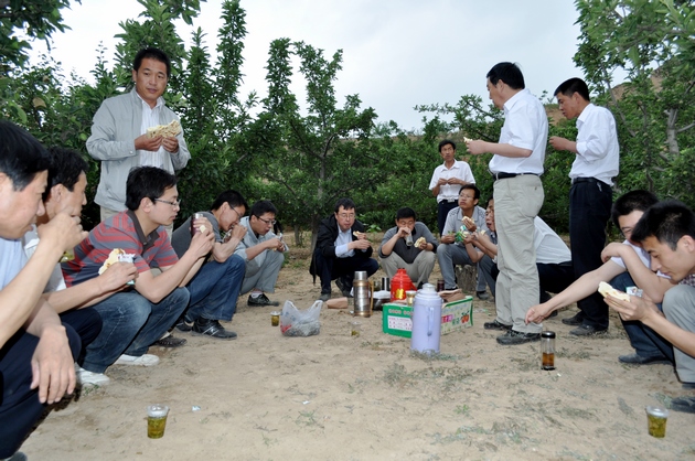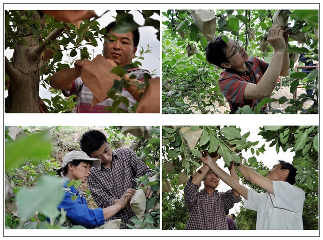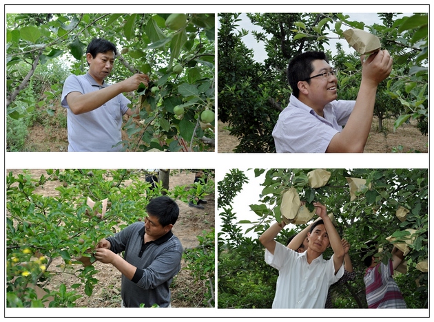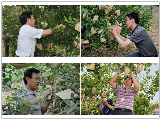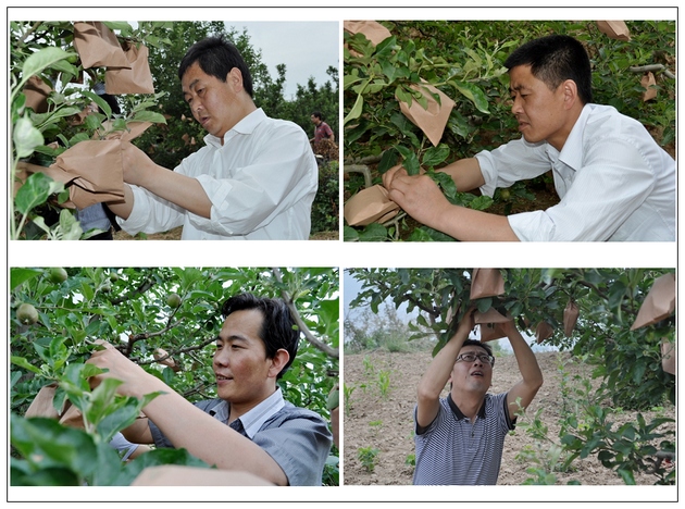 在村民劉萬錄家的果園里,經(jīng)過其妻子李小琴的現(xiàn)場演示,大家開始套袋。雖然干部們對套袋不很熟練,但是他們能吃苦,有耐心,認真細致,半天下來,累計套袋4000多只,受到果農(nóng)們的稱贊。