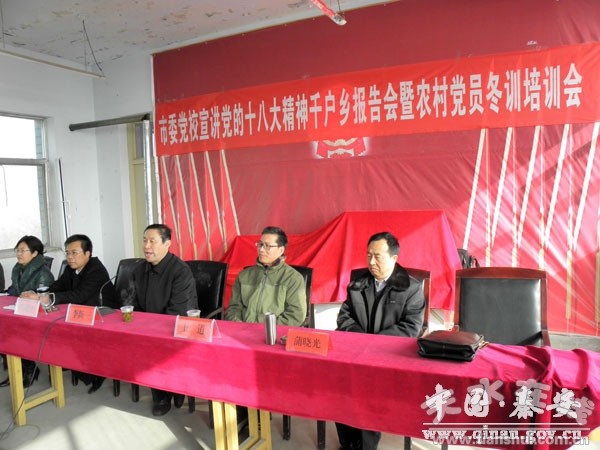 為了更好地深入推進“聯(lián)村聯(lián)戶、為民富民”行動,深入學(xué)習宣傳貫徹黨的十八大精神,全面準確把握會議的主要內(nèi)容和精神實質(zhì),更好地把廣大黨員和干部群眾的思想統(tǒng)一到黨的十八大精神上來, 12月16日上午,市委黨校宣講黨的十八大精神報告會暨黨員冬訓(xùn)培訓(xùn)會在千戶鄉(xiāng)政府四樓會議室舉行。市委黨校宣講團成員常務(wù)副校長李新一教授、副校長王道、教授趙具安、高建蘭、蒲曉光、千戶鄉(xiāng)全體黨委班子成員、全體鄉(xiāng)村干部和群眾代表共150余人參加報告會。
