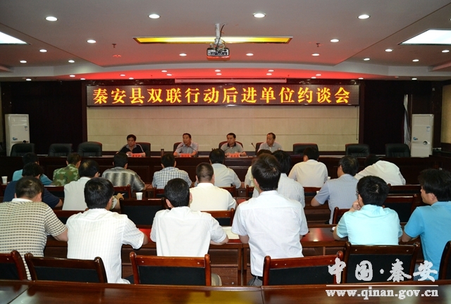 6月25日,秦安召開“雙聯(lián)”行動后進單位約談會。主要任務是認真貫徹落實省、市、縣雙聯(lián)行動領導小組會議精神和省、市雙聯(lián)辦督查意見精神,解決全縣“雙聯(lián)”行動進展不平衡的問題,進一步統(tǒng)一思想,提高認識,推動全縣“雙聯(lián)”行動向縱深推進。2012、2013年度“雙聯(lián)”行動綜合考核的后進單位的主要負責人及縣委雙聯(lián)辦全體干部參加會議。
