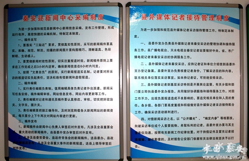 十、外宣工作制度更加健全。進(jìn)一步健全落實(shí)了全縣外宣工作協(xié)調(diào)運(yùn)行機(jī)制、外宣信息報(bào)送機(jī)制、外宣稿件采編審核機(jī)制、網(wǎng)絡(luò)安全管理制度、網(wǎng)絡(luò)信息安全保密制度、突發(fā)事件新聞報(bào)道快速反應(yīng)機(jī)制、縣外媒體記者接待管理制度、新聞稿件編審制度等。對全縣各鄉(xiāng)鎮(zhèn)、各單位、各部門外宣干事報(bào)送的新聞信息進(jìn)行統(tǒng)計(jì),編發(fā)《對外宣傳新聞信息報(bào)送和稿件刊發(fā)情況的通報(bào)》,實(shí)行月統(tǒng)計(jì)、季通報(bào)制度;編發(fā)《對外宣傳簡報(bào)》,對全縣每一季度的宣傳主題和重點(diǎn)內(nèi)容進(jìn)行階段性總結(jié),對刊發(fā)刊播在中央、省、市報(bào)刊和電視臺的新聞稿件進(jìn)行統(tǒng)計(jì)。制定了《秦安縣新聞中心稿件審核編發(fā)單》,對中國·秦安網(wǎng)發(fā)布的新聞稿件采取編輯、編審、簽發(fā)三級編審程序,通過嚴(yán)格審核把關(guān),確保稿件質(zhì)量。