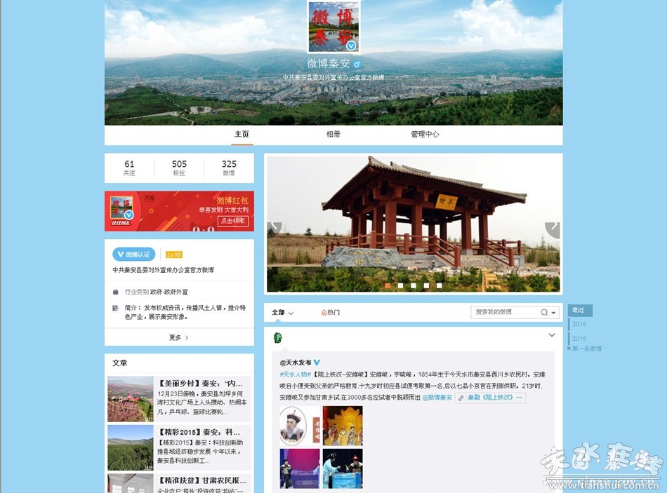 七、新媒平臺宣傳富有成效。為充分發(fā)揮新媒體的傳播優(yōu)勢,搶占輿論新陣地,增強(qiáng)宣傳影響力,縣委外宣辦于4月初開通了新浪微博“微博秦安”和微信公眾平臺“魅力秦安”兩個網(wǎng)絡(luò)新媒體,為廣大網(wǎng)民迅速、及時、便捷地獲取信息提供了全新的閱讀平臺,已成為宣傳推介秦安的重要窗口。兩個新媒體平臺以“發(fā)布權(quán)威資訊,傳播風(fēng)土人情,推介特色產(chǎn)業(yè),展示秦安形象”為宗旨,以文字、圖片、視頻等形式,第一時間發(fā)布各類型信息,其全新的信息傳播方式和清新舒適的閱讀體驗(yàn)受到廣大網(wǎng)民的喜愛,吸引了越來越多粉絲關(guān)注、轉(zhuǎn)發(fā)和點(diǎn)贊。目前,“魅力秦安”微信公眾號共發(fā)布圖文消息143組,擁有關(guān)注人數(shù)1647人;“微博秦安”官方微博共發(fā)布原創(chuàng)微博327條,擁有粉絲512人。為了完善新媒體信息服務(wù)管理,縣委外宣辦制定了《秦安縣政務(wù)新媒體信息發(fā)布制度》,保障了新媒體宣傳安全有效運(yùn)行。
